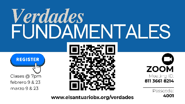 Clase de Verdades Fundamentales con el Pastor Mike Bocachica. El compromis es para cuatro clases. El curso completo requiere asistencia a las cuatro. Febrero 9 Febrero 23 Marzo 9 Marzo 23